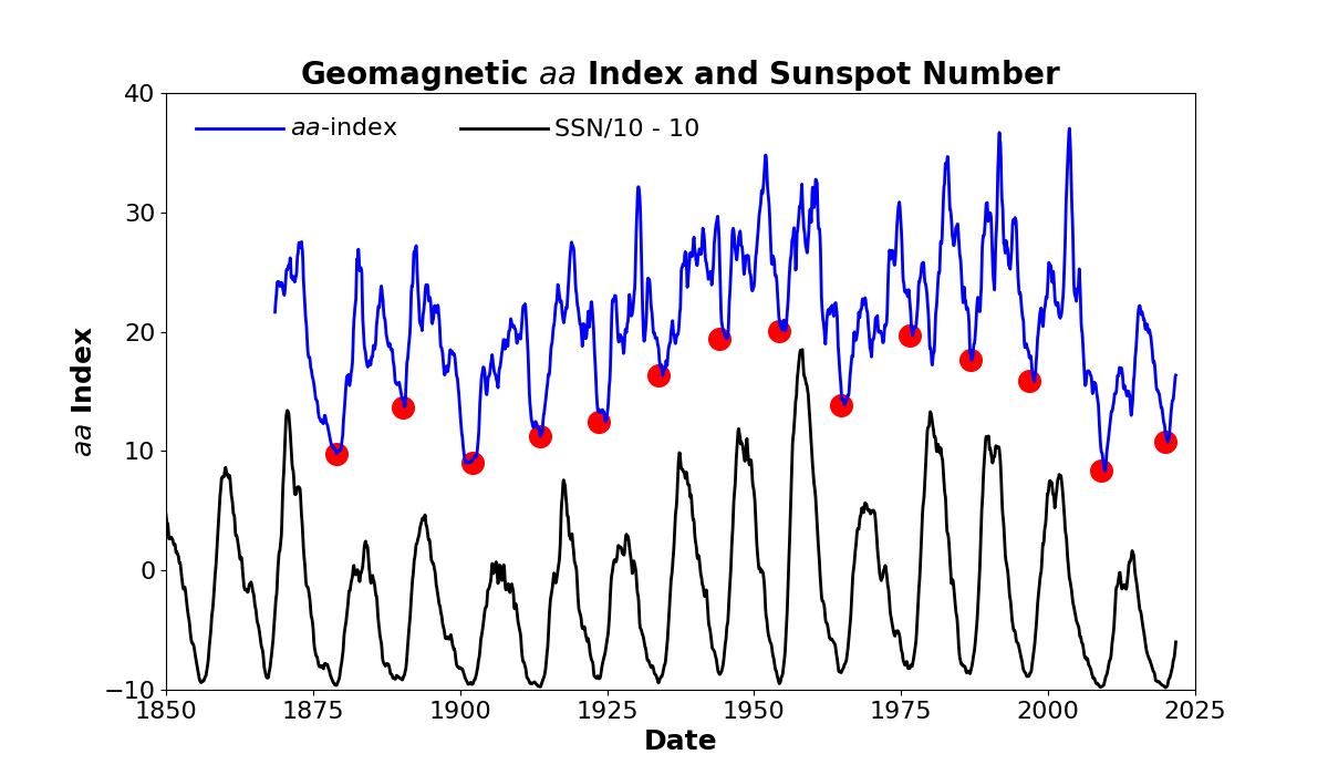 Our latest predictions for cycle 25. We have now passed the maximum of Cycle 25 - determined by the peak in the 13-month running mean of the monthly sunspot numbers. Cycle 25 maximum is now established as 160.8 in October of 2024. We are now five years into cycle 25. At this point curve fitting becomes reliable but guidance is still needed from the most reliable precursors - the Sun's polar field strength at cycle minimum and the minimum in geomagnetic activity which usually occurs shortly after minimum (see our 1999 paper ). Curve fitting based on our 1994 paper now indicates that cycle 25 will be bigger than cycle 24 (but smaller than cycle 23 - an average sized cycle), in good agreement with the polar fields and geomagnetic precursors (see further discussion below).