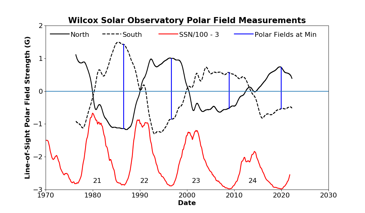 Our previous prediction was based on our early (2016 and 2018) predictions of what the Sun's polar fields would be at cycle minimum (late 2019). See more on this work below.